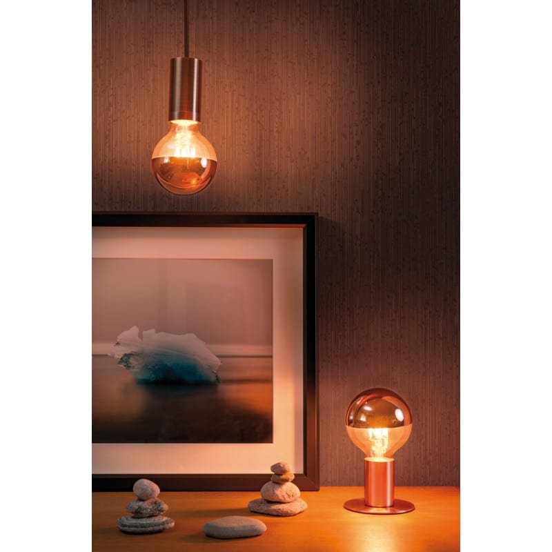 A vederla spenta sembrerebbe una comunissima lampadina, la sua forza sta infatti nel gioco di luci che è in grado di creare grazie allo specchio che la caratterizza. È la soluzione ideale per chi vuole un’atmosfera calda, rilassante ed elegante. Abbinata ad un paralume a sospensione, vi permetterà di indirizzare la sua magia nel punto che preferite e chissà che non sia una tavola imbandita!