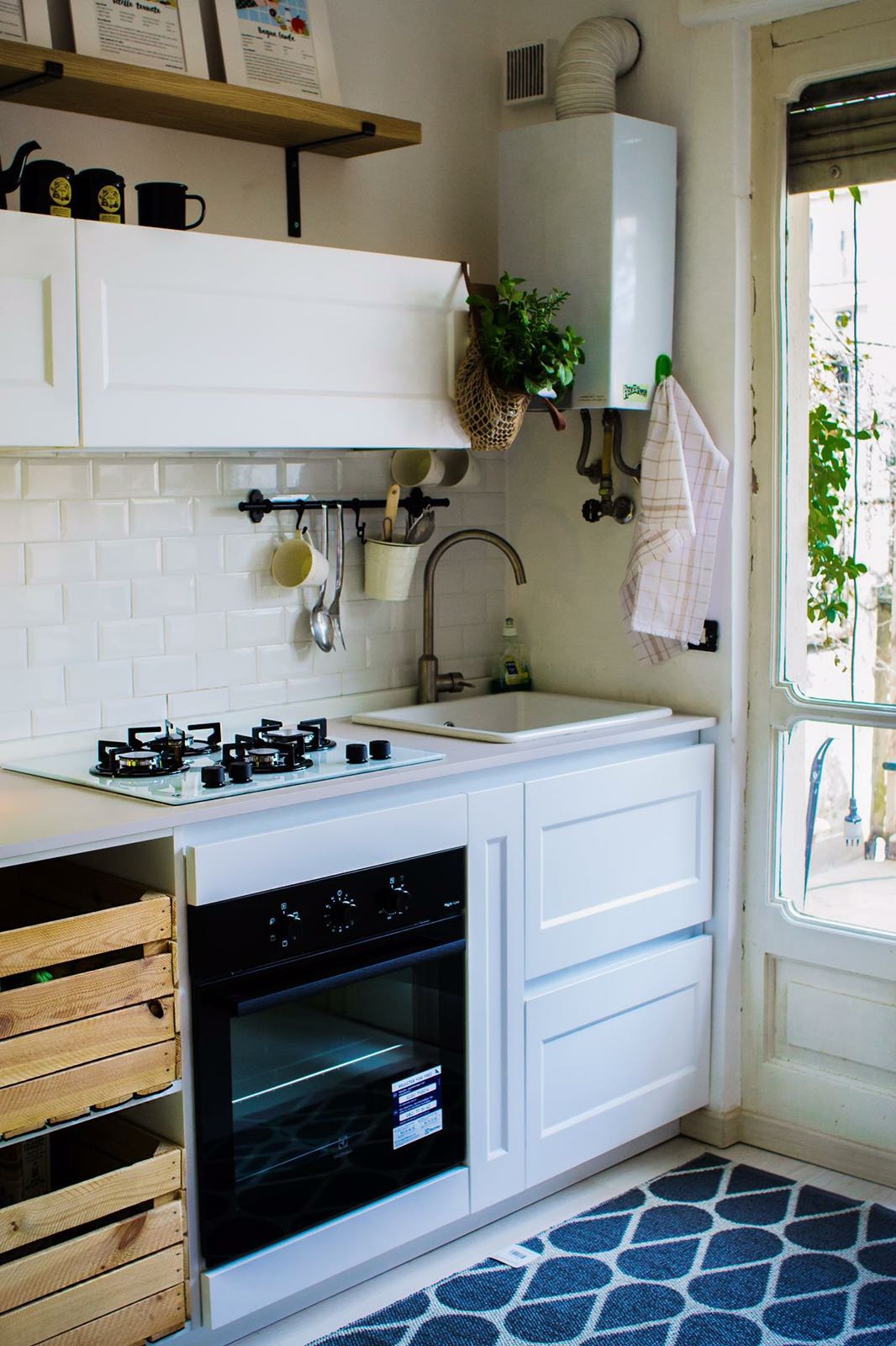 abbiamo deciso di sfruttare le altezze. Una mensola in legno “allunga” la parete della cucina rispettando a pieno la tendenza tutto a vista che è ripresa, tra l’altro, dalle cassette in legno naturale convertite in cassettoni.